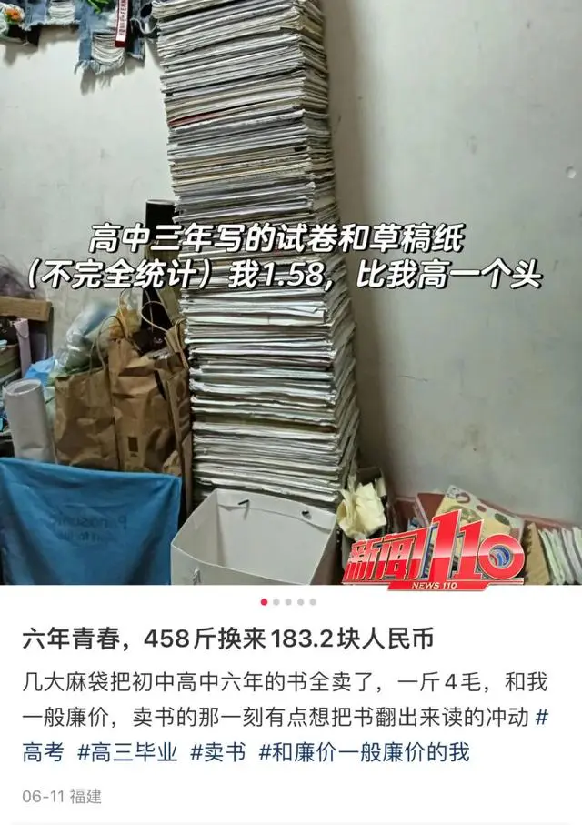 还有一位福建网友在社交媒体上晒出自己6年的青春,从初中到高中的书本和试卷,整整458斤,卖了183.2元。