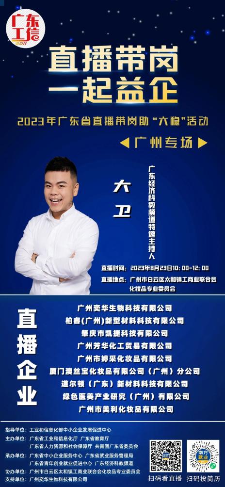 2023年广东省直播带岗助“六稳”活动由工业和信息化部中小企业发展促进中心指导,广东省工业和信息化厅、广东省教育厅、广东省人力资源和社会保障厅及共青团广东省委员会共同主办,广东省中小企业服务中心、广东省就业服务管理局、广东省青年创业就业促进中心以及广东经济科教频道共同承办。