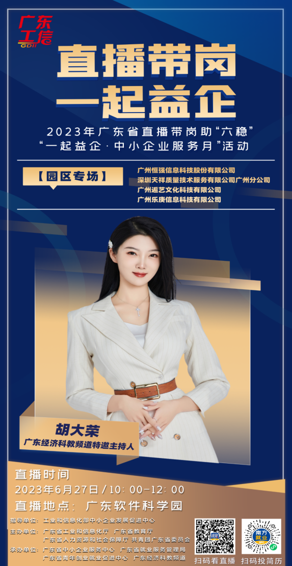 2023年广东省直播带岗助“六稳”活动由工业和信息化部中小企业发展促进中心指导,广东省工业和信息化厅、广东省教育厅、广东省人力资源和社会保障厅及共青团广东省委员会共同主办,广东省中小企业服务中心、广东省就业服务管理局、广东省青年创业就业促进中心以及广东经济科教频道共同承办。