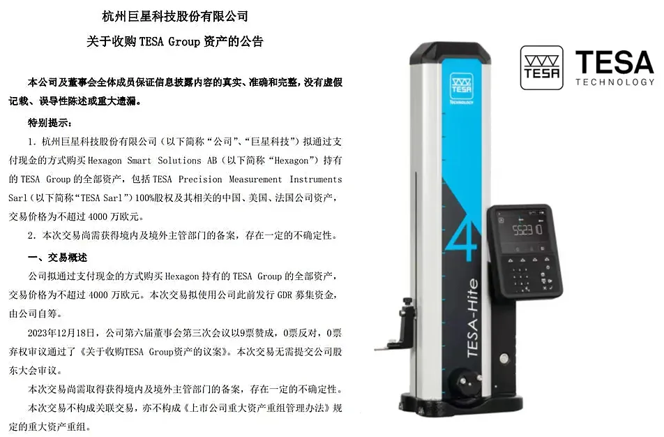 去年底,为布局机器人零部件加工相关的高精度测量工具,公司拟以不超过4000万欧元的价格,收购TESA Group。