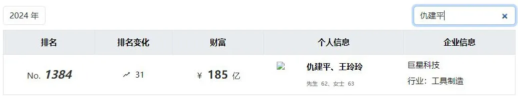 仇建平、王玲玲夫妇,以185亿元身家,位居《2024胡润全球富豪榜》第1384名。