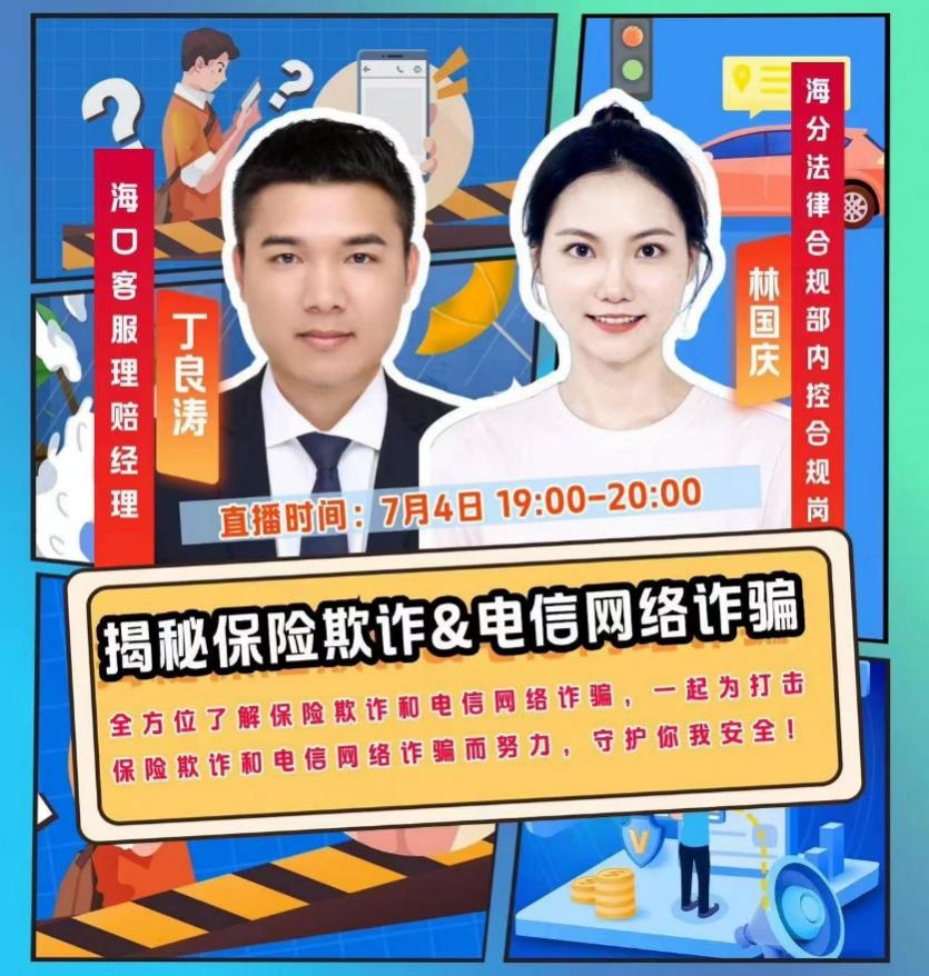 7月4日19点,平安财险海南分公司在平安好车主app,开展“揭秘保险欺诈&电信网络诈骗”金融知识宣传直播活动,重点解读保险欺诈的危害性和防范措施,分享保险欺诈典型案例。同时,进行反诈宣传,增强人民群众识骗防骗意识和能力,共同维护社会安定。