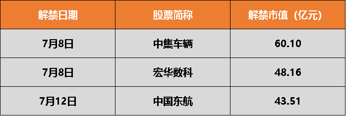 具体来看,7月8日,中集车辆与宏华数科分别解禁7.28亿股和4952万股,均为首发原股东限售股份;7月12日,中国东航解禁11.39亿股,为定向增发机构配售股份。