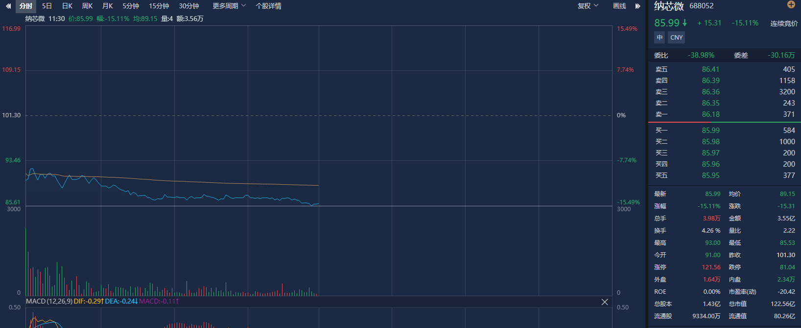 7月8日早盘,纳芯微放量大跌,截至午间收盘,纳芯微跌15.11%,报85.99元/股,成交额3.55亿元,总市值为123亿元。