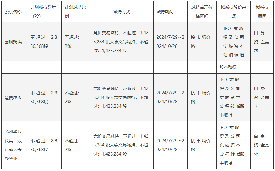 消息上,公司公告,因自身资金需求,股东国润瑞祺、慧悦成长、苏州华业及其一致行动人长沙华业计划在2024年7月29日至2024年10月28日期间,分别通过竞价交易和大宗交易方式减持不超过2850568股,即不超过公司总股本的2%,合计减持不超过公司总股本6%。