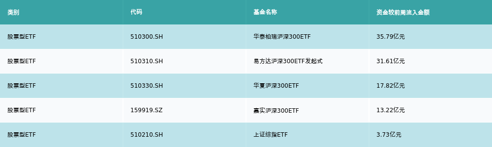 上周股票型ETF资金流入最多的5只ETF及其流入金额分别为:华泰柏瑞沪深300ETF(流入35.79亿元)、易方达沪深300ETF发起式(流入31.61亿元)、华夏沪深300ETF(流入17.82亿元)、嘉实沪深300ETF(流入13.22亿元)、上证综指ETF(流入3.73亿元)。详情见下表: