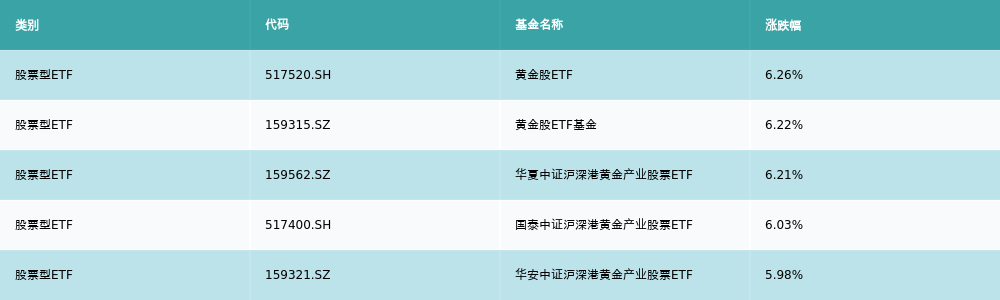 上周股票型ETF涨幅最高的5只ETF及其收益率分别为:黄金股ETF(6.26%)、黄金股ETF基金(6.22%)、华夏中证沪深港黄金产业股票ETF(6.21%)、国泰中证沪深港黄金产业股票ETF(6.03%)、华安中证沪深港黄金产业股票ETF(5.98%)。详情见下表: