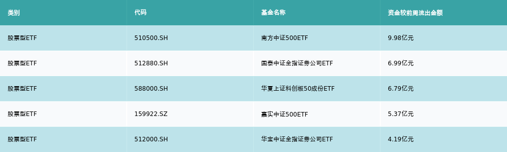 上周股票型ETF资金流出最多的5只ETF及其流入金额分别为:南方中证500ETF(流出9.98亿元)、国泰中证全指证券公司ETF(流出6.99亿元)、华夏上证科创板50成份ETF(流出6.79亿元)、嘉实中证500ETF(流出5.37亿元)、华宝中证全指证券公司ETF(流出4.19亿元)。详情见下表: