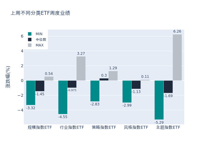 上周股票型ETF周度收益率中位数为-1.45%。其中按照不同分类,规模指数中博时上证超大盘ETF周度收益率最高,为0.54%;行业指数中国泰中证有色金属矿业主题ETF周度收益率最高,为3.27%;策略指数中南方富时中国国企开放共赢ETF周度收益率最高,为1.29%;风格指数中上证180价值ETF周度收益率最高,为0.11%;主题指数中黄金股ETF周度收益率最高,为6.26%。