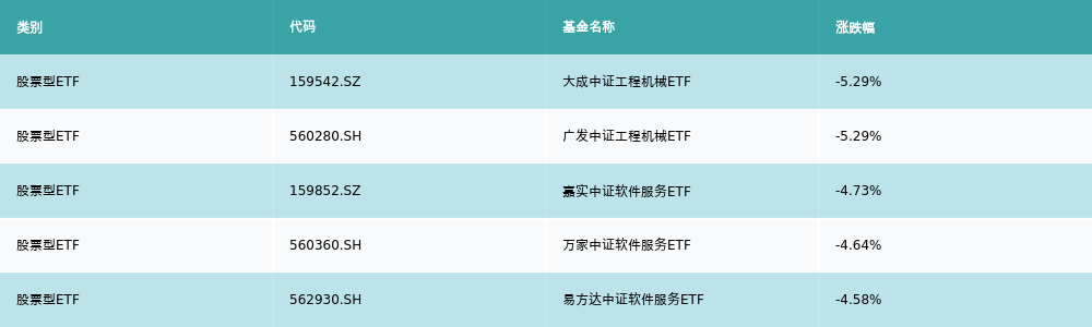 上周股票型ETF跌幅最大的5只ETF及其收益率分别为:大成中证工程机械ETF(-5.29%)、广发中证工程机械ETF(-5.29%)、嘉实中证软件服务ETF(-4.73%)、万家中证软件服务ETF(-4.64%)、易方达中证软件服务ETF(-4.58%)。详情见下表: