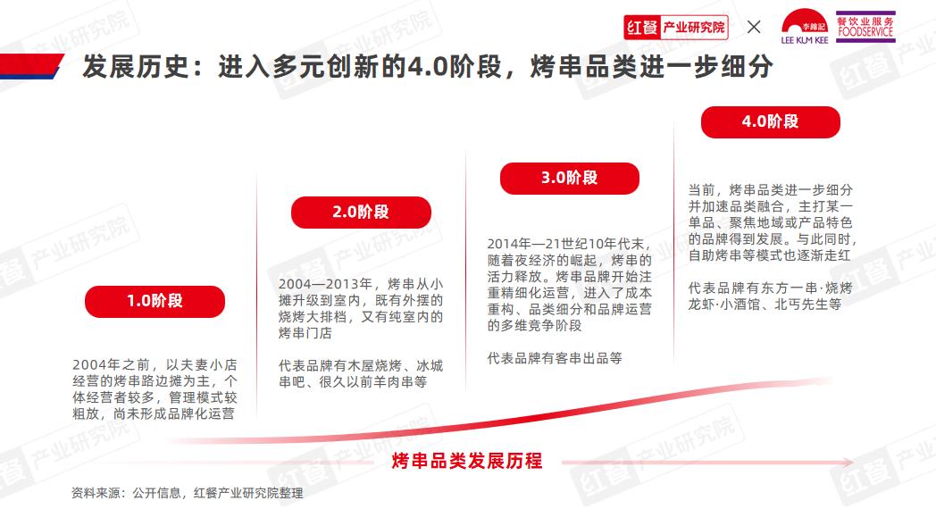 烤串在我国的发展历程可分为四大阶段,从1.0阶段的粗放经营发展至今,已进入了多元创新的4.0阶段。当前,烤串品类进一步细化和多元化,一些主打某一单品的品牌和具备地域特色的烤串品牌不断发展,产品矩阵也在不断扩大。