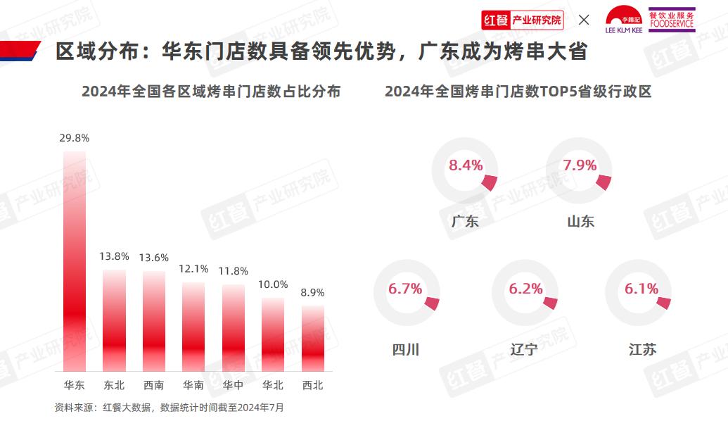 据红餐大数据,截至2024年7月,烤串门店主要集中在华东、东北、西南地区。其中,广东、山东、四川是门店数排名前三的省级行政区,占比分别为8.4%、7.9%、6.7%。