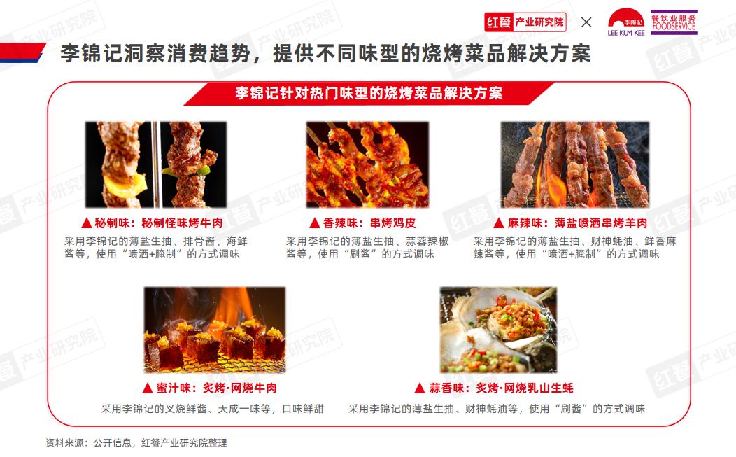 洞察到烧烤品牌特别是烤串品牌的食材需求与消费者口味偏好,李锦记为烤串品牌提供了多种菜品的解决方案。例如,针对当下使用较多的羊肉、牛肉、猪肉、鸡肉等食材,其除了提供腌制和调味等的解决方案,还针对当下流行的热门口味提供了秘制怪味烤牛肉、串烤鸡皮、薄盐喷洒串烤羊肉、炙烤·网烧牛肉、炙烤·网烧乳山生蚝等烤串菜品解决方案。