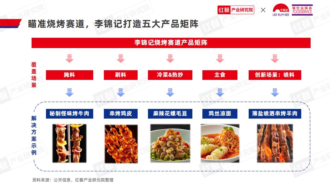 以李锦记为例,其针对烧烤赛道供应多元的原料产品,目前已形成了聚焦腌料、刷料、冷菜&热炒、主食、喷料等五大场景的产品矩阵。 李锦记将产品库中的酱油、豉油、鸡汁、蚝油、卤汁、调味酱、汤底等产品优势发挥出来,为烧烤品牌提供标准化、定制化、专业化的烧烤菜谱解决方案,助力烤串品牌提高标准化水平。