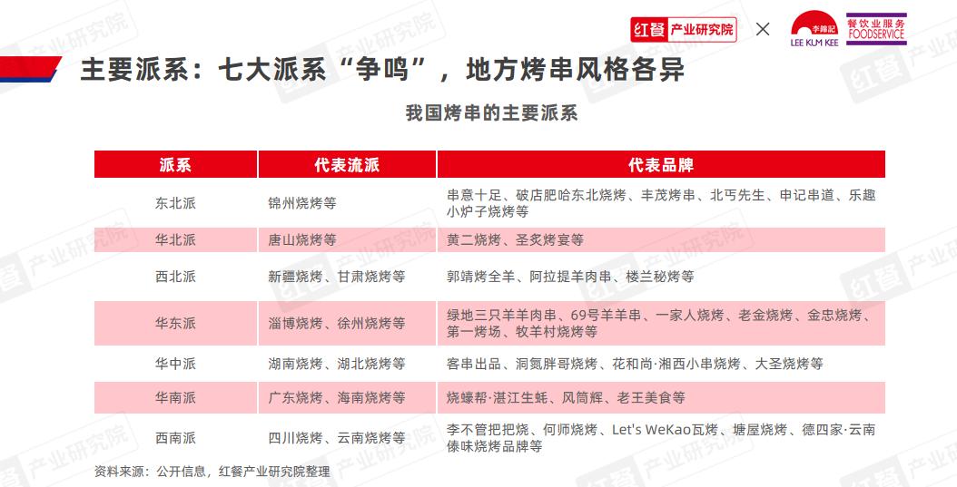 按照地域和风格的不同,我国烤串可分为七大派系:东北派、华北派、西北派、华东派、华中派、华南派、西南派,每个派别特色鲜明,并且通常拥有多个流派。