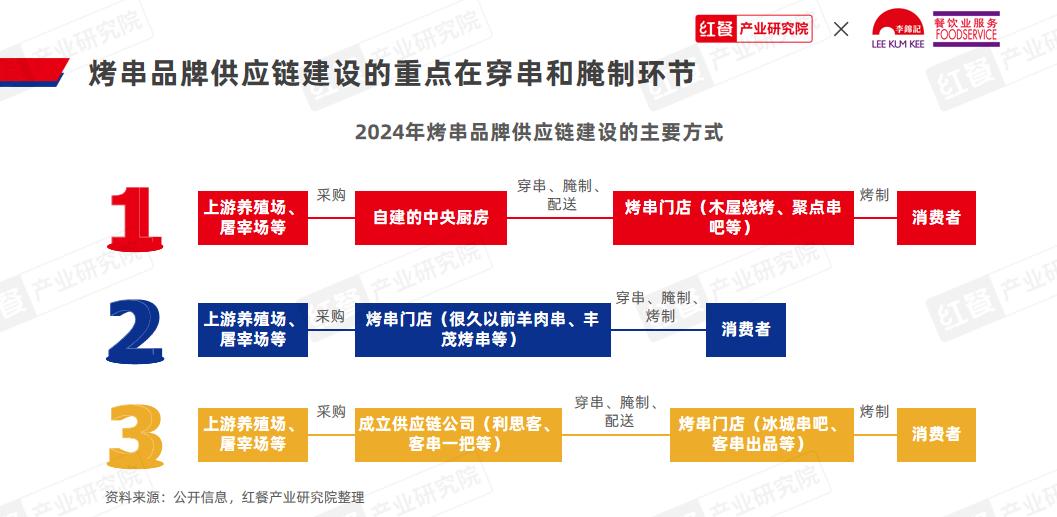 对于烤串品类来说,供应链是制约品牌扩张的关键点。 烤串品类的供应链路径相对较短,烤串品牌在建设供应链时,主要采用的是自建中央厨房、源头直采、成立供应链公司三种方式。它们的供应链公司也可为其他餐饮品牌提供食材加工服务。