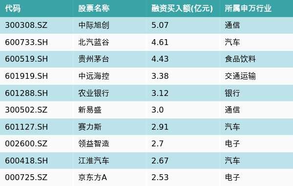 7月8日,两市共有3352只个股有融资资金买入,其中中际旭创、北汽蓝谷、贵州茅台排名前三,买入金额分别5.07亿元、4.61亿元、4.43亿元。融资买入额前10个股详情见下表: