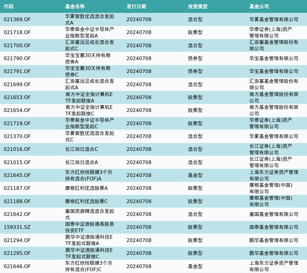 7月8日有20只新基金发行,分别为:华夏智胜优选混合发起式A、华泰紫金中证半导体产业指数型发起A、汇添富远见成长混合发起式C、华宝宝嘉30天持有期债券A、华宝宝嘉30天持有期债券C、汇添富远见成长混合发起式A、南方中证全指计算机ETF发起联接A、南方中证全指计算机ETF发起联接C、华泰紫金中证半导体产业指数型发起C、华夏智胜优选混合发起式C、长江旭日混合C、长江旭日混合A、东方红欣悦稳健3个月持有混合(FOF)A、摩根红利优选股票A、摩根红利优选股票C、富国资源精选混合发起式、国泰中证港股通高股息投资ETF、鹏华中证港股通科技ETF发起式联接A、鹏华中证港股通科技ETF发起式联接C、东方红欣悦稳健3个月持有混合(FOF)C,详情见下表: