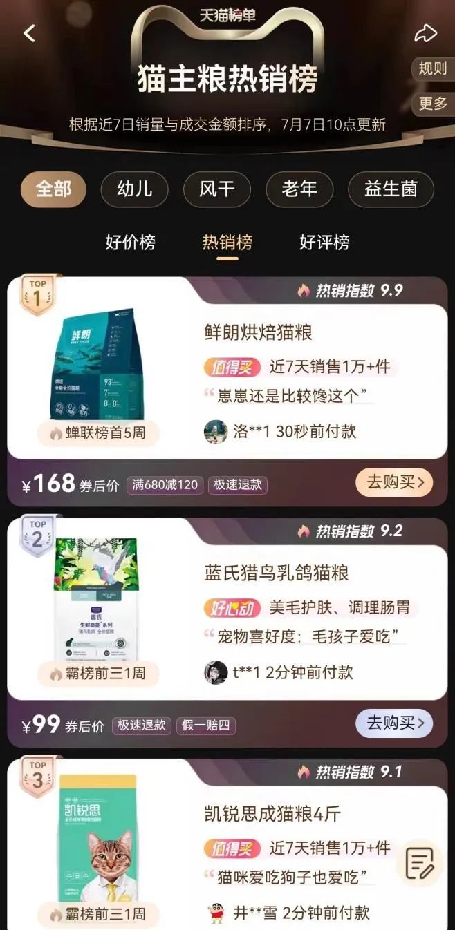 根据天猫热销榜,排名第一的鲜朗烘焙猫粮单款商品销售单件70万+,评价数7万+,紧随其后 的蓝氏猎鸟乳鸽冻干猫粮也超50万+。