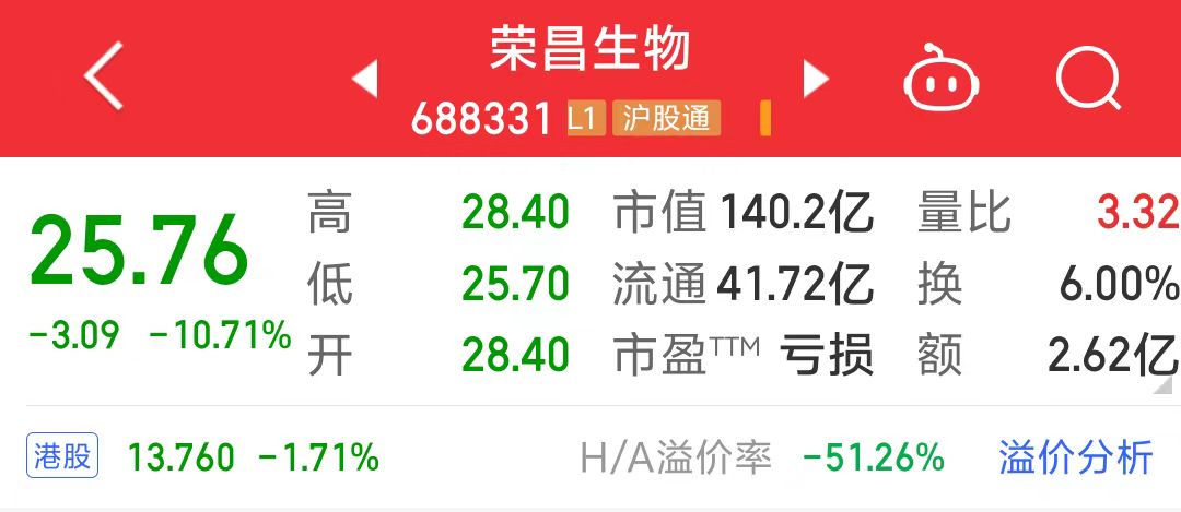截至7月10日上午收盘,荣昌生物A股股价报25.76元/股,再度下跌10.71%。其港股股价同样走低,盘中一度跌至4.71%,早间收跌1.71%,报13.76港元/股。