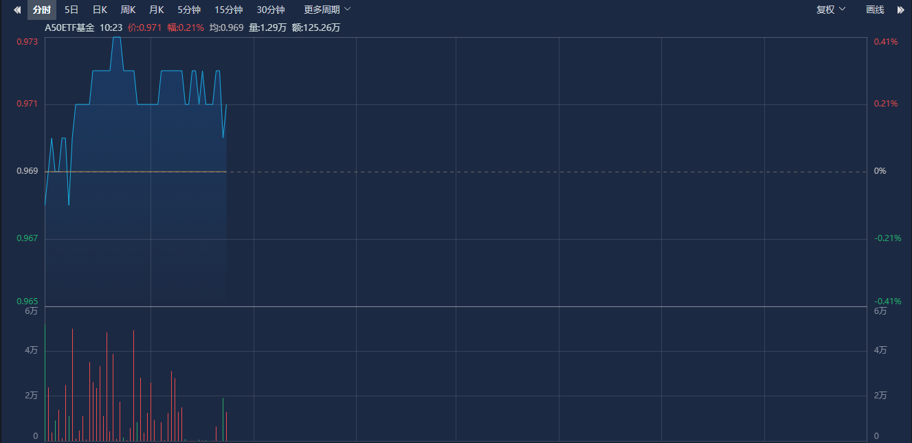 相关ETF方面,A50ETF基金(159592)早盘震荡上行,截至发稿涨超0.2%,成交额超7200万元,换手率1.93%,早盘交投活跃。