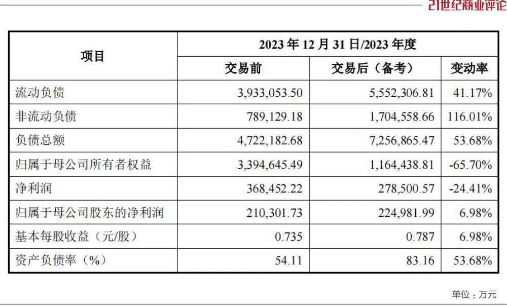 截至2023年末,其资产负债率为54.11%,交易完成后,猛升至83.16%。