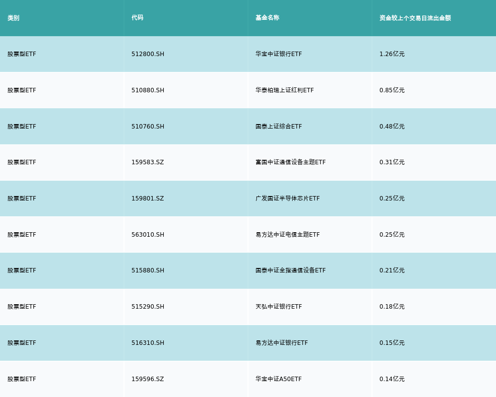昨日股票型ETF资金流出最多的3支ETF及其流入金额分别为:华宝中证银行ETF(流出1.26亿元)、华泰柏瑞上证红利ETF(流出0.85亿元)、国泰上证综合ETF(流出0.48亿元)。资金流出前10详情见下表:
