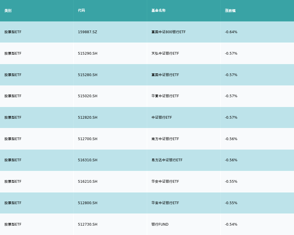 昨日股票型ETF跌幅最大的3支ETF及其收益率分别为:富国中证800银行ETF(-0.64%)、天弘中证银行ETF(-0.57%)、富国中证银行ETF(-0.57%)。跌幅前10详情见下表: