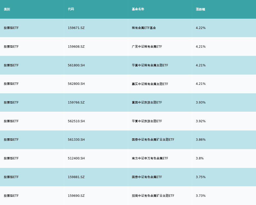 昨日股票型ETF涨幅最高的3支ETF及其收益率分别为:稀有金属ETF基金(4.22%)、广发中证稀有金属ETF(4.21%)、华富中证稀有金属主题ETF(4.21%)。涨幅前10详情见下表: