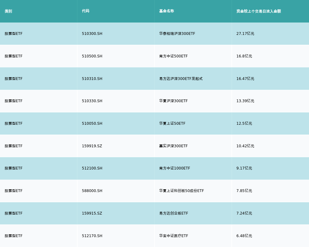 昨日股票型ETF资金流入最多的3支ETF及其流入金额分别为:华泰柏瑞沪深300ETF(流入27.17亿元)、南方中证500ETF(流入16.8亿元)、易方达沪深300ETF发起式(流入16.47亿元)。资金流入前10详情见下表: