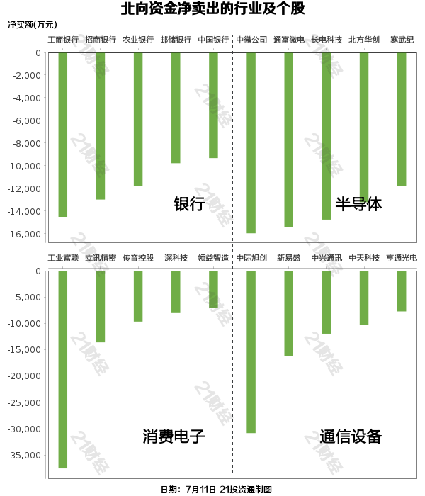 北向资金减持了24个行业,其中银行最多,净卖出金额达12.71亿元,其次是半导体行业,净卖出11.34亿元。