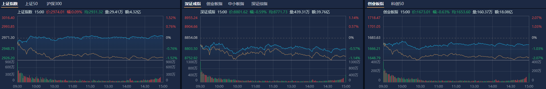 市场全天窄幅震荡,三大指数涨跌不一。南财金融终端显示,截至收盘,沪指涨0.09%,深成指跌0.59%,创业板指跌0.63%。