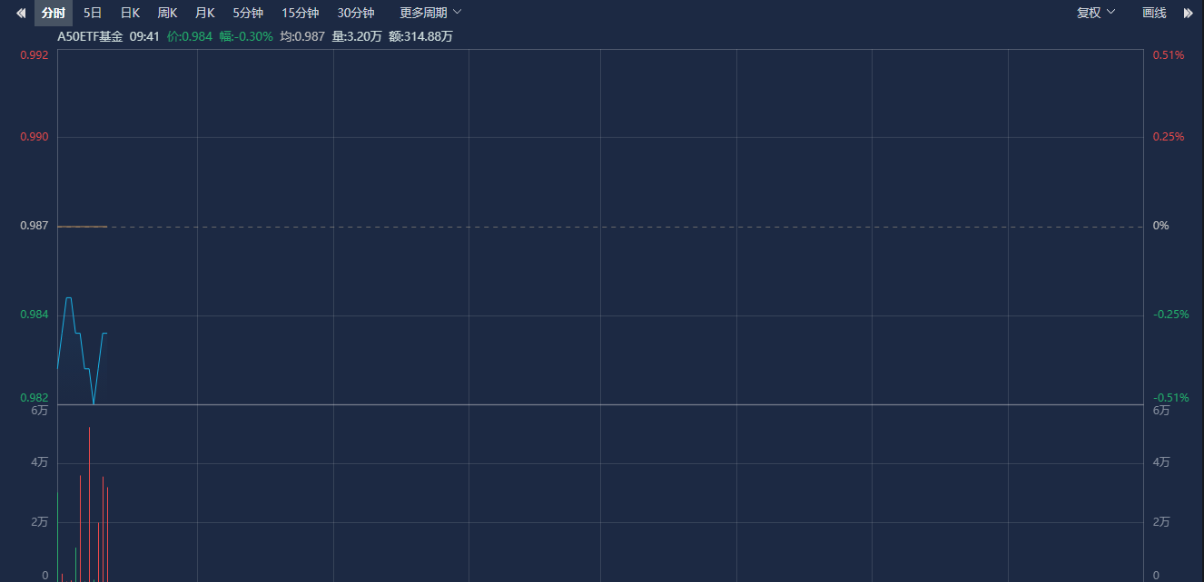ETF方面,A50ETF基金(159592)探底回升,开盘一度跌超0.5%,截至发稿跌幅收窄至0.3%,成交额超2000万元,换手率0.58%, 溢折率0.04%,盘中溢价。