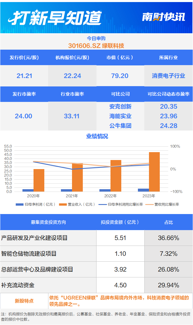 7月15日,可申购在创业板上市的绿联科技。该公司是全球科技消费电子知名品牌企业,主要从事3C消费电子产品的研发和生产,产品主要涵盖传输类、音视频类、充电类、移动周边类、存储类五大系列。最近三年,绿联科技销售金额分别为34.46亿元、38.39亿元和48.03亿元,年均复合增速达18.05%。