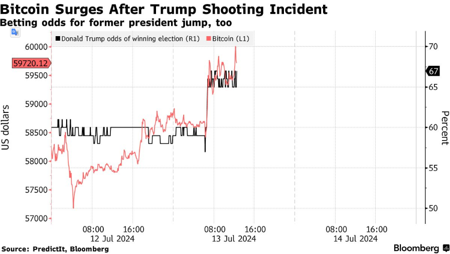 如果宽松的财政政策使债券收益率持续走高,美元就会走高。比特币在特朗普遇刺之后升至60000美元上方,可能反映了特朗普对加密货币的友好立场。