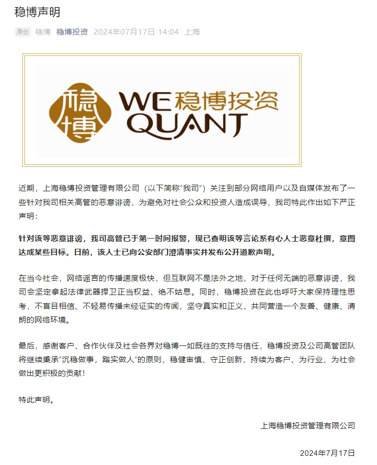 7月17日午间,国内知名百亿量化私募稳博投资发布声明表示,公司近期关注到部分网络用户以及自媒体发布了一些针对公司相关高管的恶意诽谤。为避免对社会公众和投资人造成误导,针对该等恶意诽谤,公司高管已于第一时间报警,现已查明该等言论系有心人士恶意杜撰,意图达成某些目标。日前,该人士已向公安部门澄清事实并发布公开道歉声明。