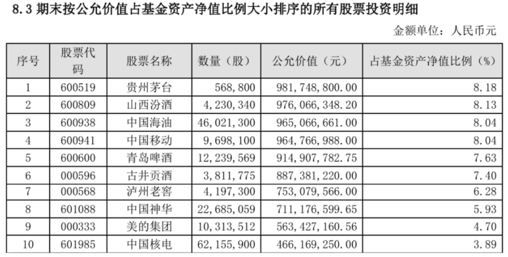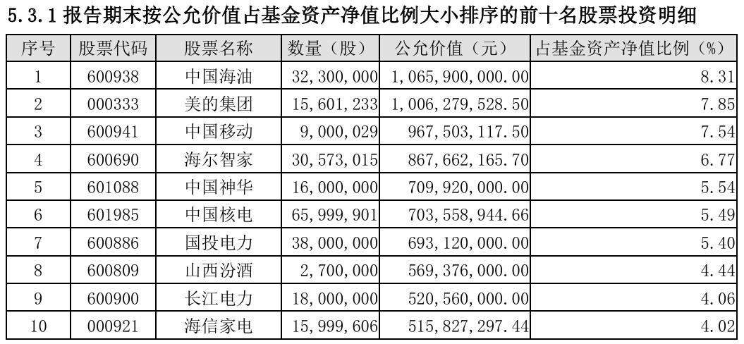 就具体仓位而言,2023年年报中,该基金投资比例居前的为贵州茅台、山西汾酒等高端白酒企业。如焦巍所言,到了今年二季度,仓位前10名已变为中国海油、美的集团等家电、能源企业。