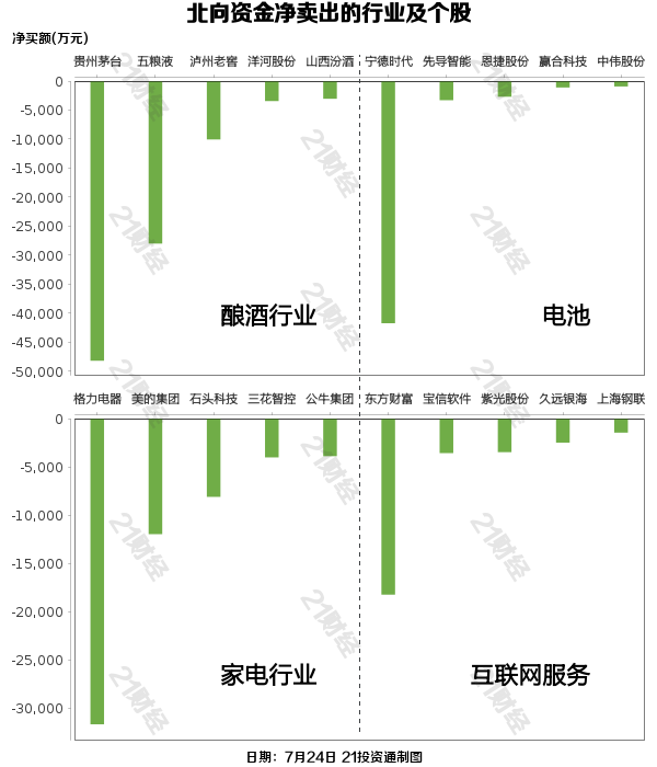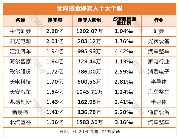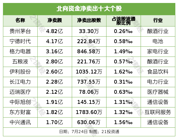 据21投资通智能监测,7月24日,北向资金净卖出22.76亿元,其中沪股通净卖出6.95亿元,深股通净卖出15.82亿元。