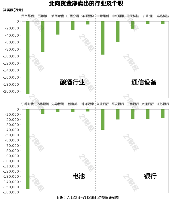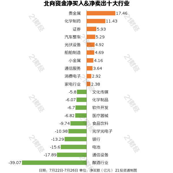 北向资金减持了69个行业,其中酿酒行业最多,净卖出金额达39.07亿元,其次是通信设备行业,净卖出17.89亿元。