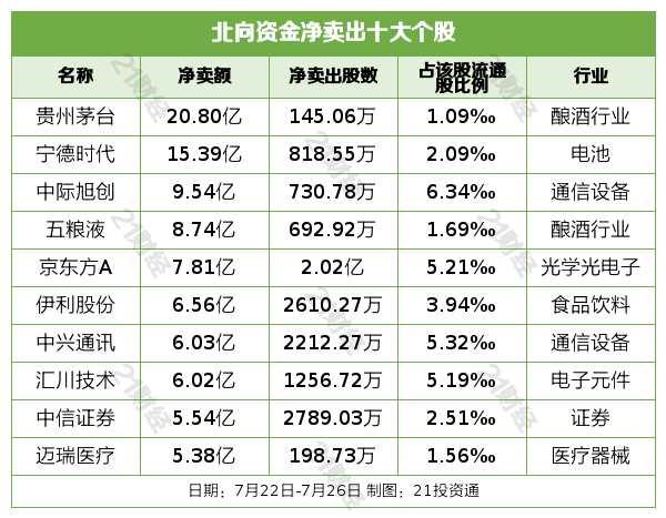 北向资金净卖出贵州茅台(600519.SH)、宁德时代(300750.SZ)、中际旭创(300308.SZ)、五粮液(000858.SZ)、京东方A(000725.SZ)居前,其中,贵州茅台被净卖出20.80亿元,宁德时代被净卖出15.39亿元,中际旭创被净卖出9.54亿元,五粮液被净卖出8.74亿元,京东方A被净卖出7.81亿元。