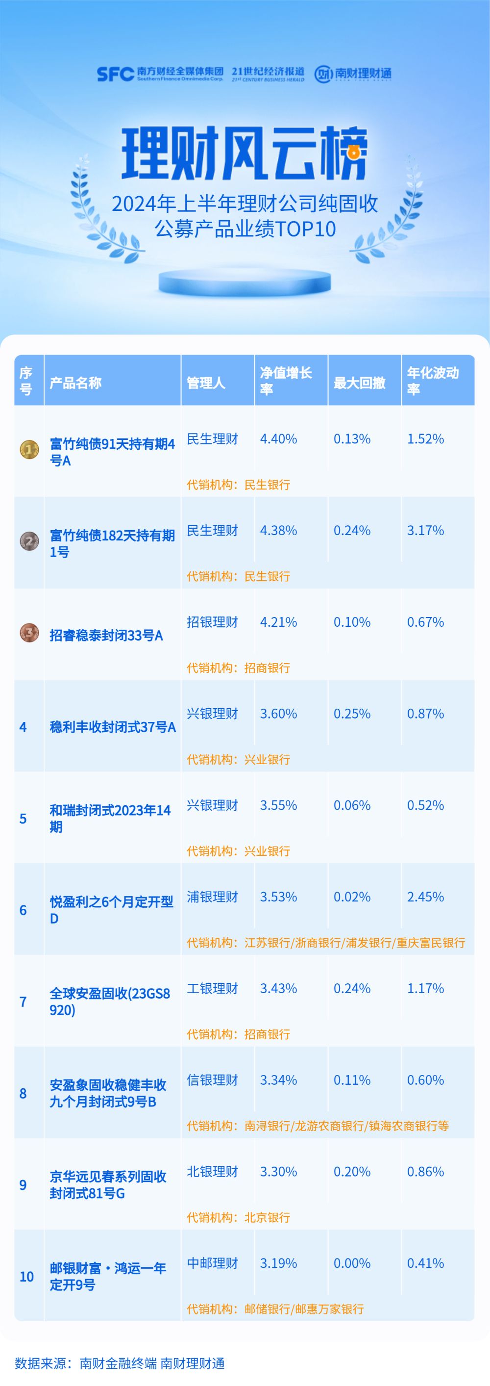民生理财“富竹纯债91天持有期4号A”和“富竹纯债182天持有期1号”以4.4%和4.38%的半年净值增长率位列榜单第一和第二,招银理财“招睿稳泰封闭33号A”位列第三,上半年净值增长率为4.21%。