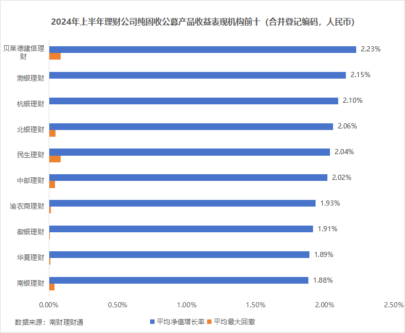 南财理财通数据显示,理财公司纯固收公募理财上半年算术平均净值增长率为1.8%(合并登记编码,投资币种人民币),算术平均最大回撤为0.05%,净值增长率中位数为1.77%。相较之下,纯债基金上半年业绩表现更为亮眼,据财信证券统计,纯债型基金表上半年业绩中位值为2.31 %,被动指数型债券基金业绩中位值为2.23%。从机构表现看,贝莱德建信理财、渤银理财和杭银理财表现较好,上半年算术平均净值增长率分别为2.23%、2.15%和2.1%。渤银理财可计算产品数量较少,仅有3只。值得注意的是,青银理财纯固收产品上半年净值增长率仅为0.89%,为唯一一家平均净值增长率低于1%的机构。