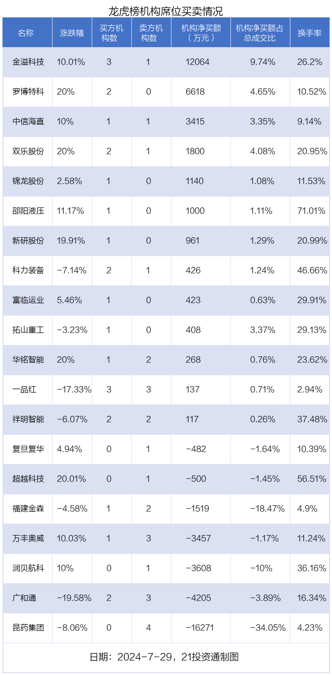 7月29日,20只个股龙虎榜出现了机构的身影,机构合计净卖出1266.44万元。具体来看,机构净买入13股,净卖出7股。