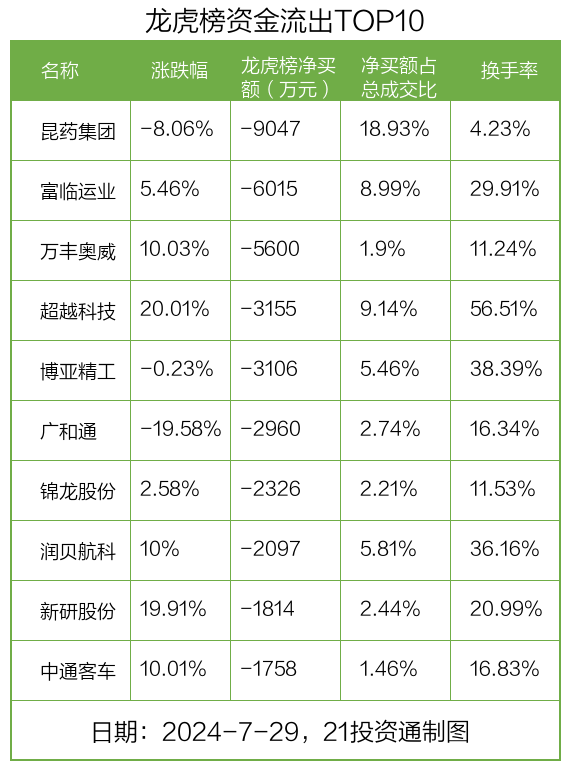 而龙虎榜中资金净流出最多的是昆药集团(600422.SH),被净卖出为0.9亿元,占总成交金额的18.93%。昆药集团收盘下跌8.06%,换手率为4.23%。