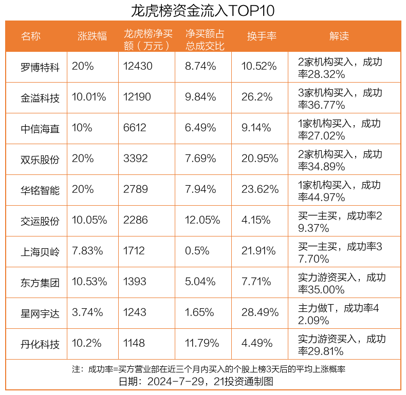 7月29日,上证指数上涨0.03%,深证成指下跌0.96%,创业板指下跌1.44%。盘后龙虎榜数据显示,共有41只个股因当日异动登上龙虎榜,资金净流入最多的是罗博特科(300757.SZ),达1.24亿元。