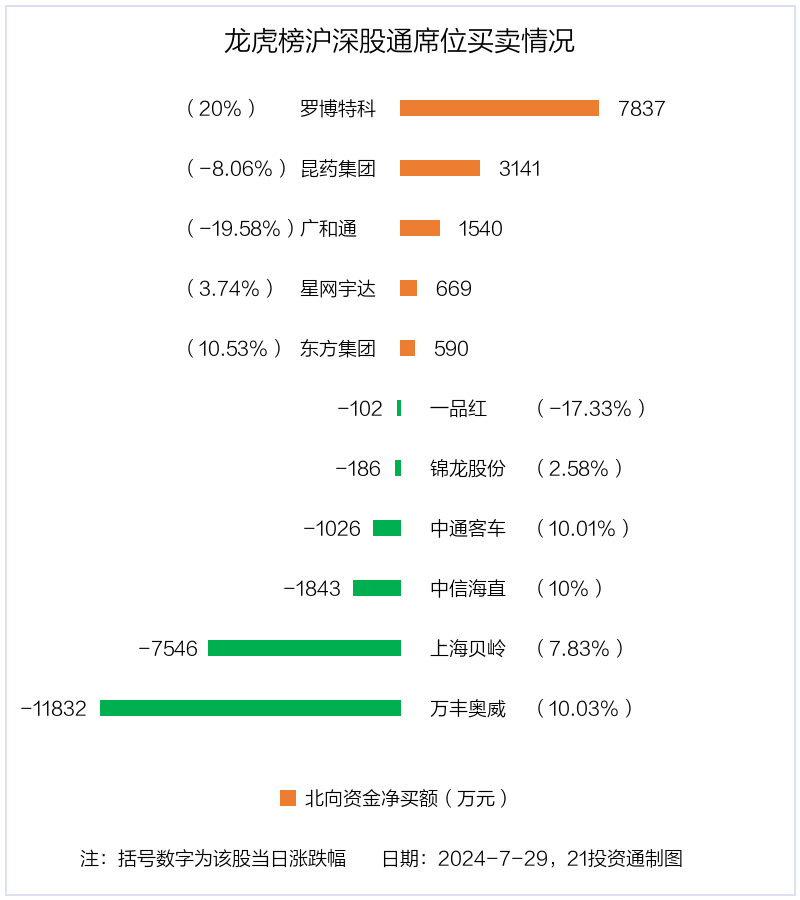 7月29日,北向资金参与龙虎榜中的个股共有11只,合计净卖出8757.83万元。其中沪股通净买入2 股,净卖出1 股,合计净卖出3815.32万元;深股通净买入3 股,净卖出5 股,合计净卖出4942.51万元。
