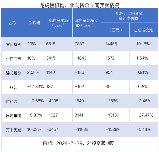值得注意的是,机构和北向资金共同净买入了罗博特科等1股;共同净卖出了万丰奥威;在昆药集团,广和通,一品红,锦龙股份,中信海直上出现分歧,机构净卖出昆药集团1.63亿元,北向资金净买入3140.87万元;机构净卖出广和通4205.18万元,北向资金净买入1539.55万元;机构净买入一品红137万元,北向资金净卖出102.12万元;机构净买入锦龙股份1139.98万元,北向资金净卖出186.28万元;机构净买入中信海直3414.58万元,北向资金净卖出1842.76万元。