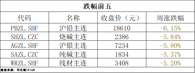 上周国内期货主连跌幅位居前五的分别是沪铅-6.15%、烧碱-5.84%、沪银-5.80%、纯碱-5.37%、线材-5.20%。