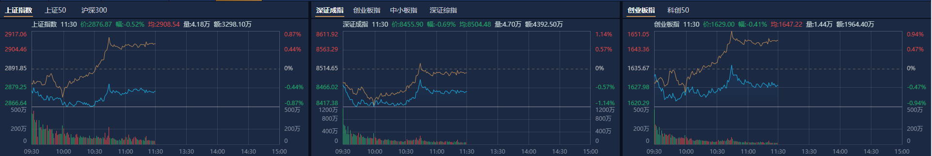 市场早盘震荡调整,三大指数均小幅下跌。南财金融终端显示,截至早盘收盘,沪指跌0.52%,深成指跌0.69%,创业板指跌0.41%。总体上个股涨多跌少,全市场超3600只个股上涨。