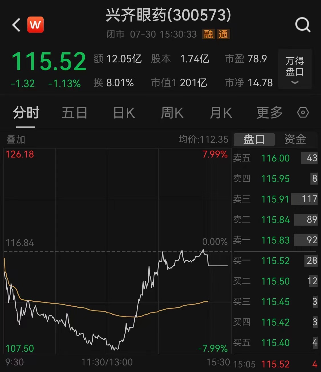 截至7月30日收盘,兴齐眼药跌1.13%,报115.52元/股,盘中一度跌超6%。